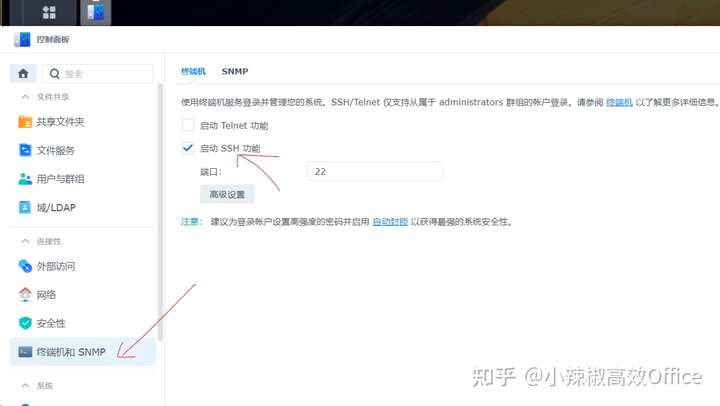 群晖本质上还是一个Linux系统,也可以通过ssh来连接,并且可方便使用ssh命令行来管理 。群晖打开ssh命令行的设置很简单,进入控制面板,找到终端机和SNMP, 勾选上启动SSH功能即可,如果你有防火墙,需要在防火墙放行22端口: