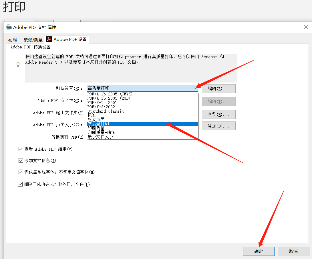 Adobe PDF文档属性-默认设置,改成高质量打印,确定。